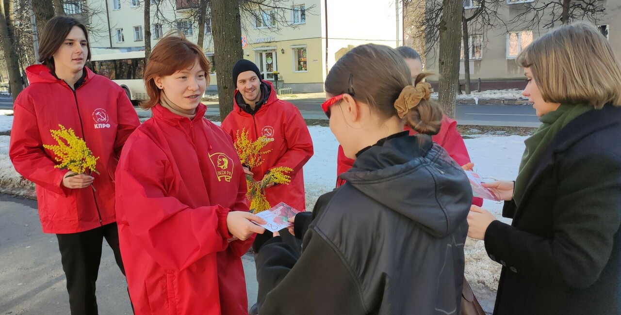 Представительницам прекрасного пола различных возрастов вручались поздравительные открытки от Новгородского обкома КПРФ и веточки мимозы. Всё это сопровождалось добрыми словами и пожеланиями весеннего настроения.