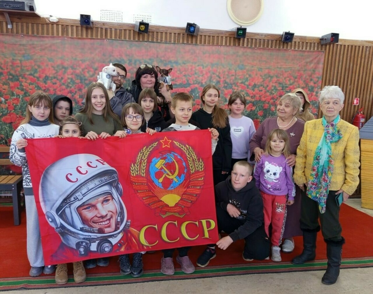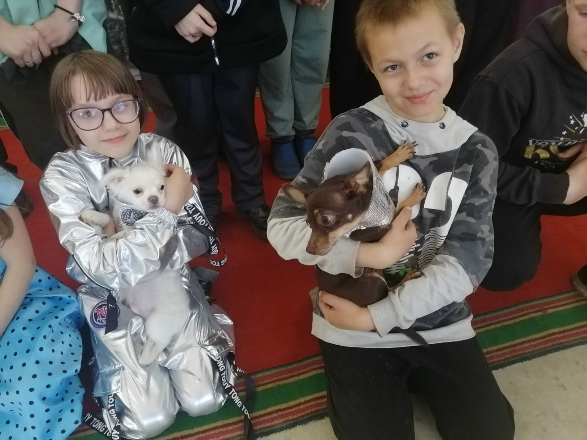 Затем с ребятами был проведён видео-урок – после просмотра ролика об истории первого полёта в космос, состоялось живое обсуждение увиденного, ребята ответили на все контрольные вопросы ведущего. Отдельной изюминкой стало выступление живых, четвероногих артистов – собак, которых в тот день звали Белка и Стрелка. Питомицы Ольги Барановской, одетые в космические костюмы, очень порадовали ребят.