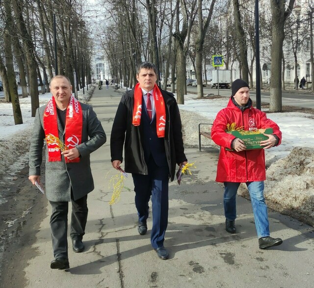 Комсомольцы Великого Новгорода передали эстафету старшим товарищам. Сегодня, в Международный женский день, на улицы города с поздравлениями вышли уже представители партактива Новгородского городского отделения КПРФ: Андрей Михеев, Валерий Глазунов и Игорь Ковалев.