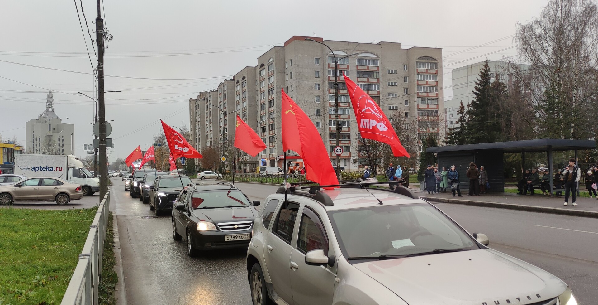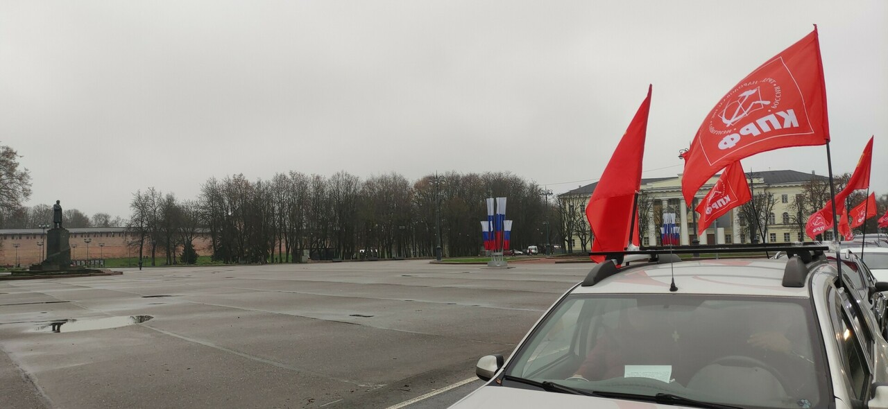 Автопробег в честь 108-й годовщины Великой Октябрьской Социалистической революции прошёл сегодня, 8 ноября, в Великом Новгороде. Организатором выступил Новгородский обком КПРФ.