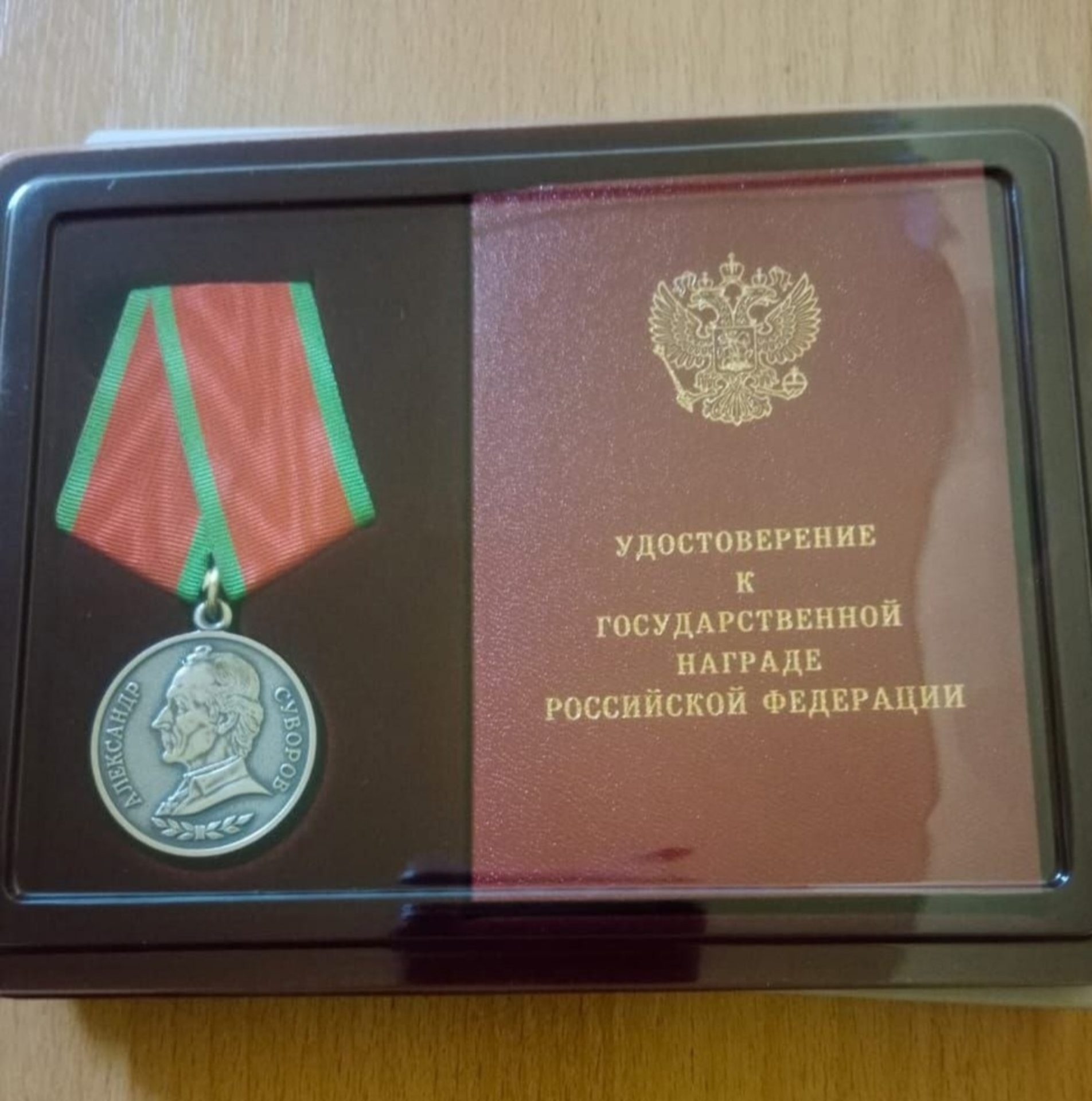 Медаль Суворова — одна из боевых государственных наград Российской Федерации, утвержденная 2 марта 1994 года. Медалью Суворова награждаются военнослужащие за отвагу и личное мужество, которые были проявлены при защите Отечества и государственных интересов Российской Федерации в боевых действиях. Награда изготавливается из чистого серебра.